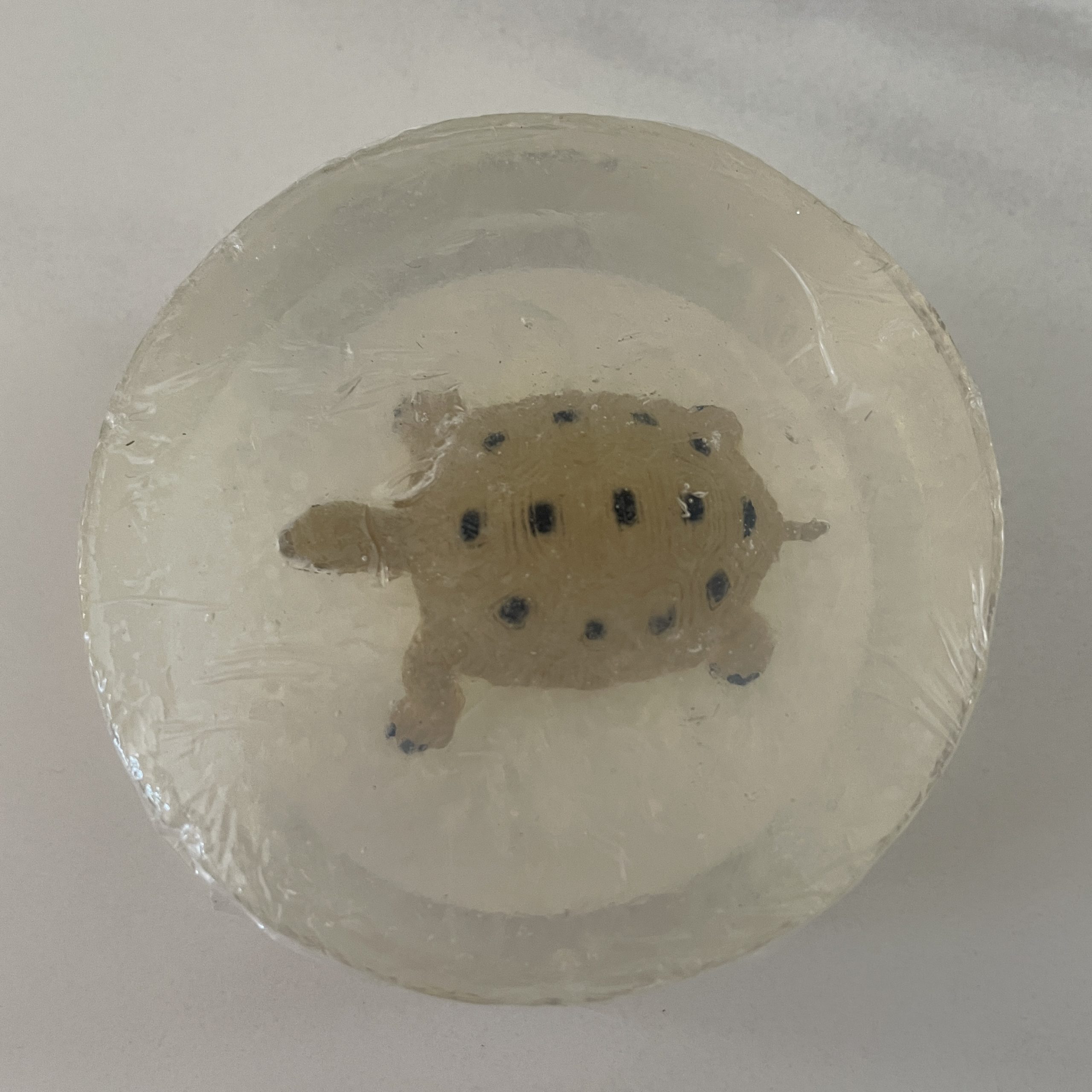 This unscented crystal clear glycerin bar has a toy dinosaur figurine inside the soap.